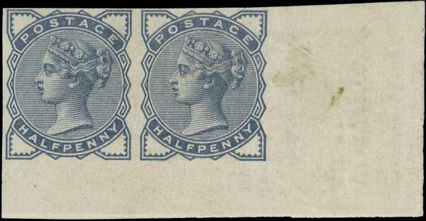 1883-84 ½d slate blue, lower right marginal, imperforate horizontal pair, fine large part o.g. very scarce. SG 187a £6500+