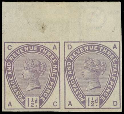 1883-84 1½d lilac (AC-AD) top marginal, imperforate horizontal pair, fine large part o.g. very scarce. SG 188a, £6500+