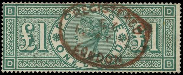 1891 £1 green (DB), used struck by Registered London oval d/s in red, for 07 MR 92, top left corner crease, otherwise fine, most unusual. SG 212