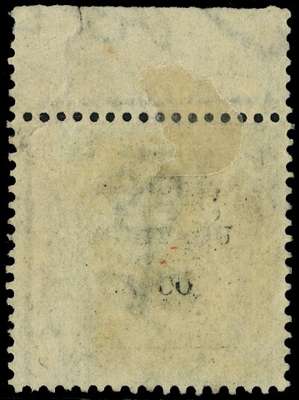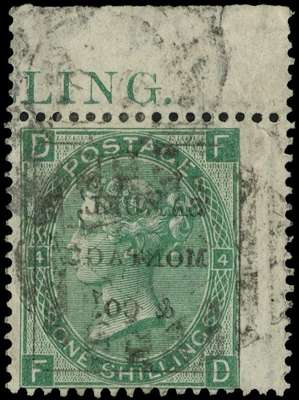 1864 Samuel Montagu & Co. unofficial underprint type 47 (Letters 2mm), in black on 1/- green Plate 4 (FD) with intact selvage showing full offset on surface, used, tear to selvage at top (adhesive unaffected), otherwise fine, most unusual and scarce. Spec. PP194
