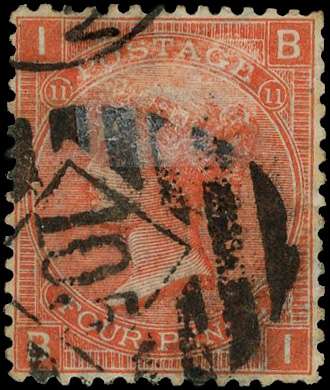 1867 Copestake, Moore, Crampton & Co London unofficial underprint type 16 in red on 4d vermillion Plate 11 (BI), showing VARIETY UNDERPRINT DOUBLE, cancelled by London numeral, missing perf at foot, otherwise fine, scarce. Spec. PP58a, £1500