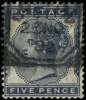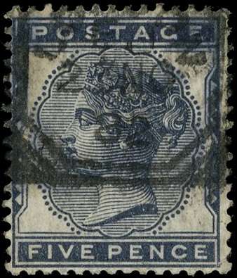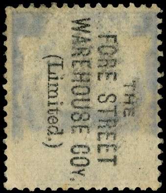 1868 The Fore Street Warehouse Coy (Limited) unofficial underprint, type 28 in black, reading downwards on 5d indigo, used, very scarce, currently unlisted with underprint reading downwards. Spec. PP118var