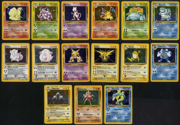 Featuring all the holographic cards apart from a Machamp, this set includes the coveted Charizard, Venusaur and Blastoise and 15 holographic cards in total. The holos in this bundle are all between very light play and near mint condition with the only visible imperfections is slight 'silvering' around the edges of some of the cards.