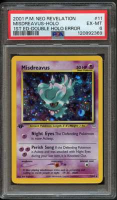 This lot features a 1st edition holo Misdreavus from the 2001 Neo Revelation expansion. This copy is a coveted ‘double holo’ error - the holographic pattern that is present has had two layers printed on the card making it incredibly shiny and exhibits multiple swirls/holographic patterns.