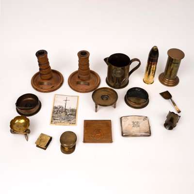 Trench Art - includes Candlesticks made from the Teak of HMS Terrible whose guns relieved Ladysmith, solid silver hallmarked Birmingham 1916 Honourable Artillery Company presentation cigarette case etc. (15 items)