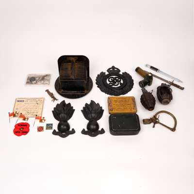 Various items, including Cutaway Mills Bomb, American Mk2 Grenade (Pineapple grenade), 0.303 no.4 Lee Enfield rifle ...