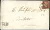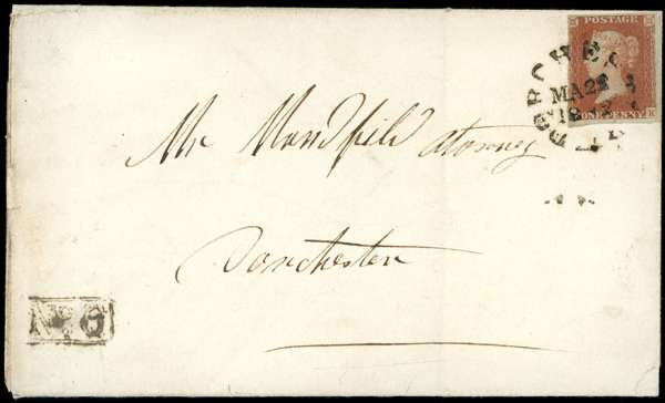 1841 1d Red-brown (EK). Entire sent locally within Dorchester bearing a three margin 1d Red-brown (SG8, EK) tied by a crisp black Dorchester (small type 22.5mm) ‘Wessex’ datestamp for MA.22.1842. Scarcity B in Danzig & Goldsmith. Attractive. SG8, Spec. B1(1)va. Cat £2750.