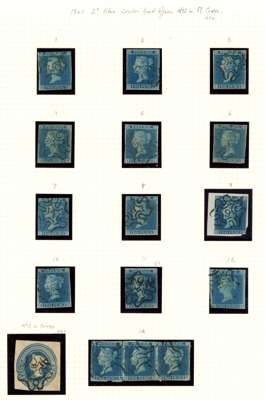 1841 2d Blue Pl.3 & 4. Wonderful group of twelve 1841 2d's cancelled by London No.1-12 MC's. A difficult set to assemble so fine. Offered with an additional strip of three bearing No.12 MC's and a 2d Embossed cut from stationary cancelled by a No.1. MC SG14, Spec. E1va-vl. Cat £10,650. (14).