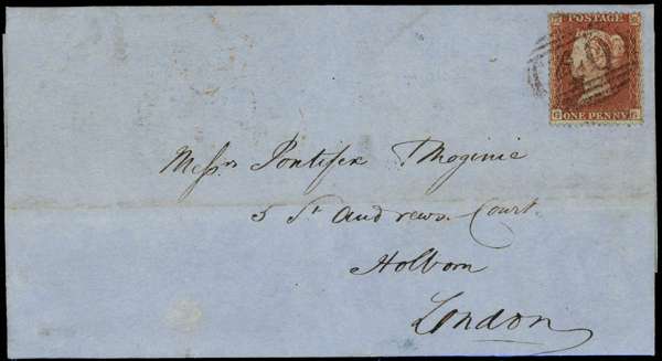 1854 1d Red-brown Pl.R2. (Die I, Alphabet II, Wmk. Small Crown, Perf 16). Cover addressed to London bearing a 1d red-brown lettered GG tied by a brown Bagshot ‘40’ numeral with a matching datestamp on reverse for MY.7.1855. Superb strike of this rare cancellation on cover. SG17. Spec. C1(1)ug. Cat £4500.
