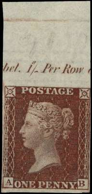 1862 1d Rose-red Pl.R16. Unused top marginal imperforate imprimatur lettered AB. Scarce reserve plate imprimatur. Spec. C13(3).