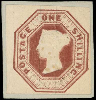 1847 1s Embossed. Very fine unused essay without pendant curl printed in brown on silk thread paper. Mounted on small piece of greyish white wove paper, couple of light tones on Queen’s portrait. Spec. EP2b. Cat. £8500