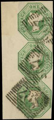 1854 1s Green (Die W.W.2). Used four margin left hand marginal vertical strip of three showing variety ‘Thread omitted’ on bottom two examples due to severe misplacement and only just clipping the top example, cancelled by Kirkwall ‘207’ Scottish numerals. Fair condition for such a multiple. SG55. Spec. H1(2)ca/cb.