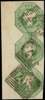 1854 1s Green (Die W.W.2). Vertical strip 1 thread/no thread