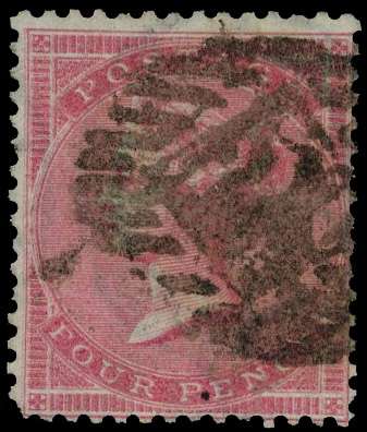 1856 4d Pale carmine (Wmk. Medium garter, ordinary thin white paper). Fine used example ‘printed double’, cancelled by an indistinct London Chief Office numeral. Rare, the only example we have handled in over 25 years, possibly unique. 1986 RPS Certificate. SG65a. Spec. J49a.