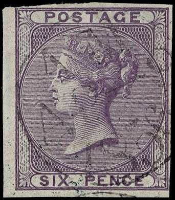 1856 6d Lilac plate proof. Very fine imperforate example printed in lilac on thin white unwatermarked wove paper, cancelled by a London cds trial cancellation for AP.9.1856. Small thin at top centre and very close at upper left. Scarce. SG69. Cat. £7500.