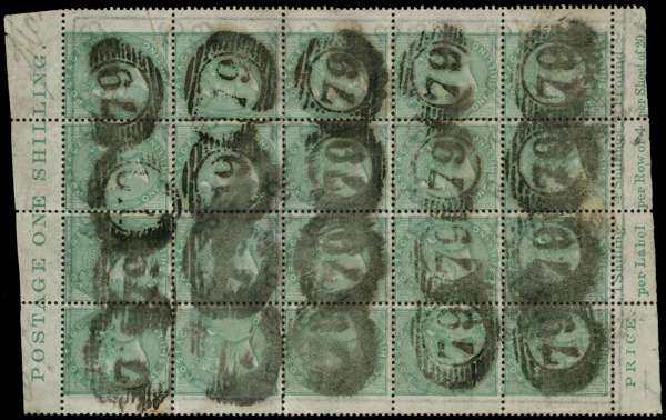 1856 1s Pale green. Fine used complete pane of twenty with sheet margin and inscription at top and bottom. Some minor faults as to be expected and rather heavily cancelled by London district office ’79’ numerals. Nevertheless, a very rare and possibly unique multiple. SG73.