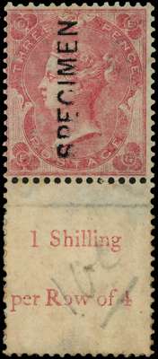 1861 3d Rose Pl.2. (State 1 with shaded spandrels). Unused part o.g. bottom marginal example lettered EG, overprinted "SPECIMEN" type 6 (Vertically). Toned gum on reverse. Spec. J25As.