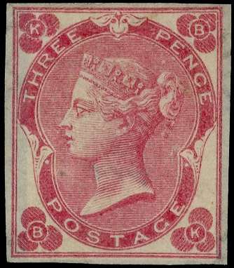 1862 3d Rose (Plate 3, with dots). Fine unused four margin (close at top right) imperforate imprimatur lettered BK, Scarce one of only 24 possible examples in private hands. SG78. Cat. £6000
