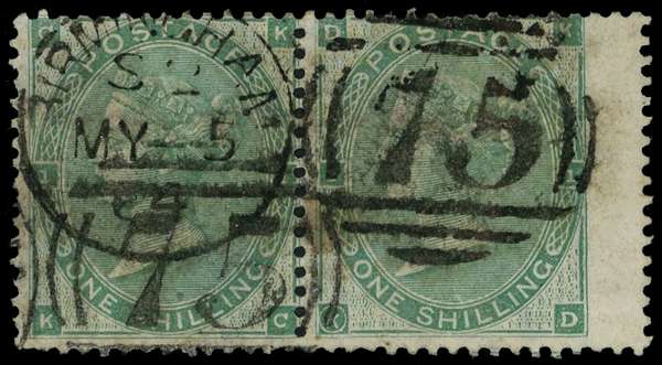 1862 1s Green Pl.2. Fine used horizontal pair lettered KC-KD cancelled by Birmingham ’75’ duplexes for MY.5.1864, Right hand stamp KD showing ‘K in white circle’ variety. Some manuscript offset on reverse nevertheless a very presentable example of this difficult variety. SG90a. Cat. £2750.