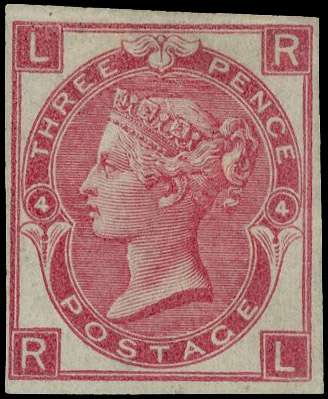1865 3d Rose Pl.4. Very fine imperforate plate proof on unwatermarked white wove paper lettered RL. Scarce. SG92. Cat. £3800.