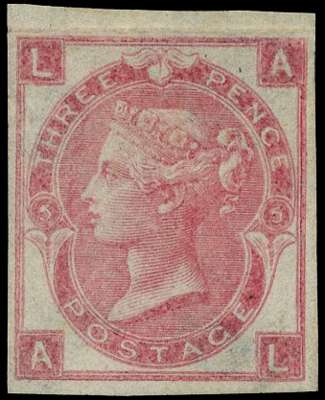 1865 3d Rose Pl.5 (Wmk. Emblems). Very fine unused imperforate ‘abnormal’ imprimatur lettered AL. Scarce one of only 23 possible examples in private hands. Plate 5 was never issued on Emblems paper and examples are only obtainable from the imprimatur sheet. SG92. Cat. £4250.