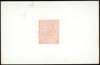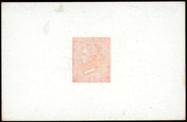 1867 4d Die proof. Fine example printed in vermilion on white glazed card (92x60mm) with void corner letters and plate numbers, some light surface rubbing. Produced for the 1867 Paris Exhibition. Scarce. SG94. Cat. £7000
