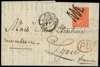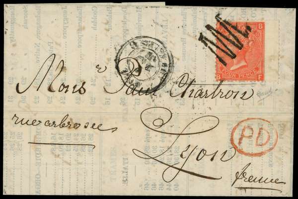 1869 Overseas Mail. Very fine prices current printed list sent from London to Lyon, France. Prepaid with a 4d deep vermilion Pl.11 tied by a zig-zag inspectors cancellation. Lyon receiving cds on reverse for MY.3.1869. Unusual. SG95.