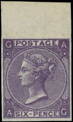 1865 6d lilac Pl.5. Very fine unused o.g. top marginal imperforate imprimatur lettered AG. Scarce one of only 25 possibl…