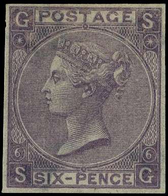 1867 6d lilac Pl.6. Very fine unused o.g. top marginal imperforate imprimatur lettered SG. Scarce one of only 21 possible examples in private hands. Superb colour. SG97. Cat. £4800.