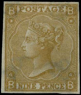 1865 9d Straw Pl.4 (Wmk. Emblems). Very fine unused o.g. imperforate imprimatur lettered BB. Scarce one of only 25 possi…