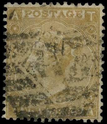 1865 9d Straw Pl.4 (Wmk. Emblems). Good used example lettered TA showing error of watermark W20a ‘Three roses and a shamrock’, cancelled by an indistinct London Chief Office numeral. SG98b. Spec. J94c. Cat. £2500.