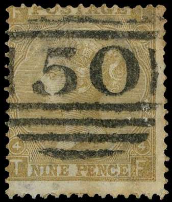1865 9d Straw Pl.4 (Wmk. Emblems). Fine used example lettered TF showing error of watermark W20b ‘Three roses and a thistle’, cancelled by a crisp Barnstaple ’50’ numeral. Some light paper creases and peripheral tones. 2007 BPA Certificate. SG98c, Spec. J94g. Rare, unpriced in catalogue.