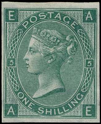1865 1s Green Pl.5 (Wmk. Emblems). Very fine unused o.g. imperforate imprimatur lettered AE. Scarce; one of only 22 possible examples in private hands. Plate 5 was never issued on Wmk. Emblems paper. SG101. Cat. £5500.