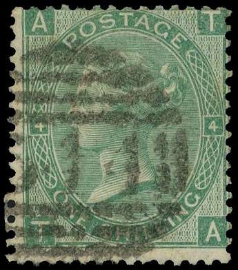 1865 1s Green Pl.4 (Wmk. Emblems). Good used example lettered TA showing error of watermark W20a ‘Three roses and a shamrock’, cancelled by an indistinct part numeral. SG101a, Spec. J103d. Cat. £1800.