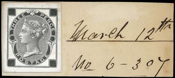 1870 3d Rose Pl.6. Very fine striking book piece printed in black on white glazed card, mounted on piece of original page, annotated ‘March 12th’ and with plate and current number ‘No 6-307’, unique. SG103. Cat. £1650.