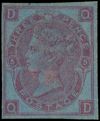 1868 3d Rose Pl.5. (Dr. Perkins blued security paper). Very fine unused o.g. imperforate example of this scarce paper trial lettered QD. SG103. Spec. J30b. Cat. £3600.