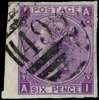 1870 6d Mauve Pl.9. Very fine used left hand wing margin imperforate example lettered AI, neatly cancelled by a Manchester ‘498’ numeral. Excellent colour. SG109a. Cat. £4000.