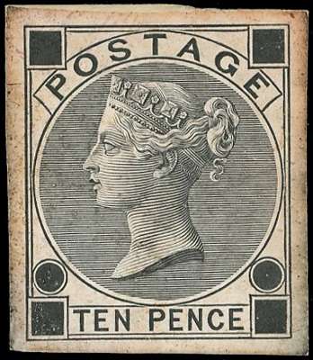 1867 10d Die proof. Fine example printed in black on white glazed card with uncleared corner squares and plate numbers, trimmed to stamp size. Usual peripheral toning. Ex DLR Striking books. SG112. Cat. £3200