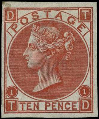 1867 10d Red-brown Pl.1. Very fine unused imperforate imprimatur lettered TD, light corner crease at upper left. Scarce one of only 25 possible examples in private hands. SG112. Cat. £5000.