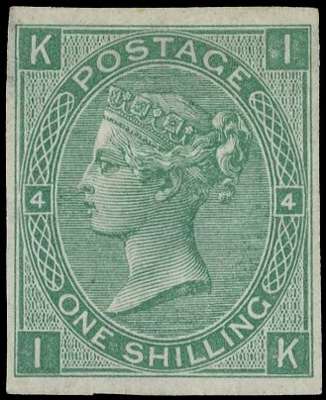1867 1s Green Pl.4. Very fine and fresh unused imperforate example lettered IK. Rare. SG117b. Cat. £6500…