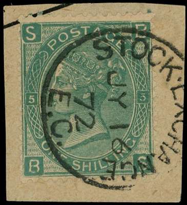 1872 Stock Exchange Forgery Pl.5. Very fine used example with impossible lettering lettered BS, tied to a small piece of telegraph form by a Stock Exchange cds for JY.16.1872. SG117. Cat. £1500.