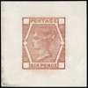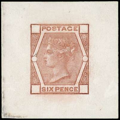1873 6d Die proof. Fine example printed in deep brown on white glazed card cut down to 38x38mm, with cleared corner squ…