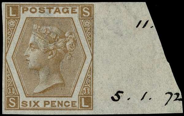 1872 6d Chestnut Pl.11. Very fine unused imperforate right hand marginal imprimatur lettered SL. Endorsed in margin with the plate number ’11’ and date of registration ‘5.1.72’. Scarce one of only 21 possible examples in private hands. SG122. Cat. £3800.