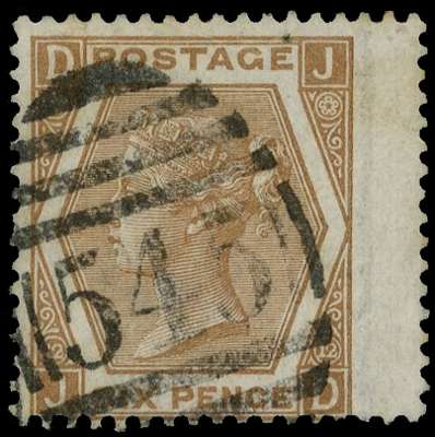 1872 6d Pale chestnut Pl.12. Very fine used right hand wing margin example of this scarce ‘abnormal’ issue lettered JD, neatly cancelled by a Newcastle on Tyne ‘545’ numeral. 1981 RPS Certificate. SG124a. Cat. £3500