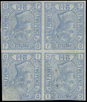 1880 2½d Blue Colour Trial Pl.15 (Wmk. Orb inverted). Fine unused o.g. imperforate horizontal block of four lettered IC-JD, printed in a distinctly paler blue shade compared to the issued colour. Some surface rubbing on ID, spots on IC, and several diagonal gum creases, nevertheless a very rare multiple. SG142. Cat. £16,000.