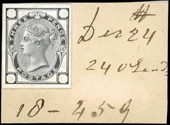 1874 3d Rose Pl.18. Very fine striking book piece printed in black with void corner letters on white glazed card, mounted on piece of original page, annotated ‘DE 24/240 leads’ and with plate and current number ‘10-459’, unique. Unlisted in Spec. 1 Catalogue. SG143.
