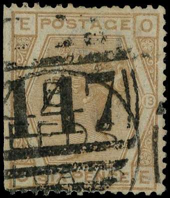 1873 6d Pale buff Pl.13. Fine used example of this rare abnormal issue lettered OE, trimmed wing margin at left as normally sen. Cancelled by a Leeds ‘447’ duplex for ‘?1. JA.1873’ Rare, approximately only 50 used examples recorded. 1987 Holcombe Certificate. SG145. Cat. £25,000.