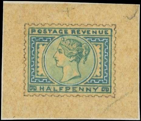 1881 ½d Green. Superb hand painted essay from De La Rue’s first scheme painted on tracing paper (30x26mm) in green and Chinese white mounted on stout white paper. Only two such sets of essays were produced, one of which is in The Postal Museum thus unique in private hands. Ex DLR Archives. Cat. £8500