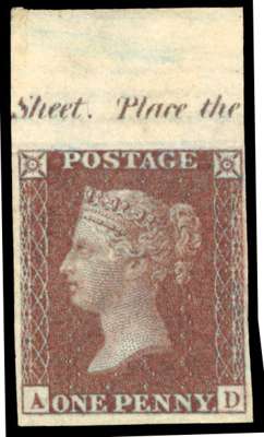 1855 1d Red brown Pl.R19 (AD). Unused top marginal imperforate imprimatur showing part sheet inscription. Very rare, one of only 21 possible example many of which are in institutional collections. SG29, Spec. C8. Cat. £1800.