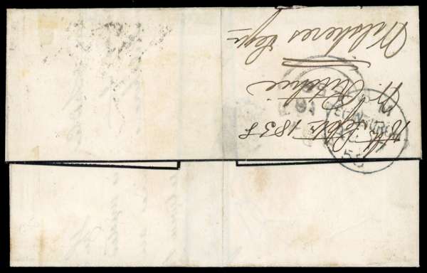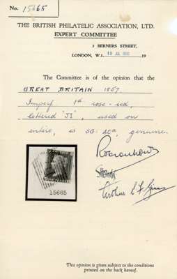 1857 1d Rose-red Pl.55 (Die II, Alphabet III, Wmk. Large Crown). Entire sent from Dunbar to Edinburgh bearing an imperforate example lettered JI tied by a Dunbar ‘111’ Scottish numeral. Adhesive touched at lower right, small tear and vertical crease nevertheless scarce variety on cover. SG40a, Spec. C10(1)k. Cat £2500 as a used example off cover. 1950 BPA Cert.